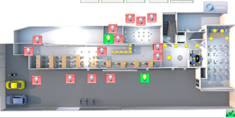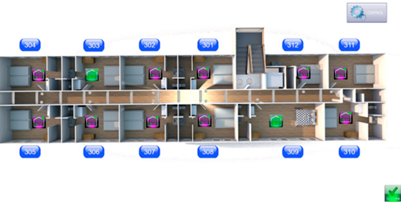 Permite que desde recepción puedan interaccionar con cada habitación y gestionar la iluminación de las zonas comunes con programaciones horarias, relojes astronómicos e incluso gestionar los detectores de presencia de las estancias.